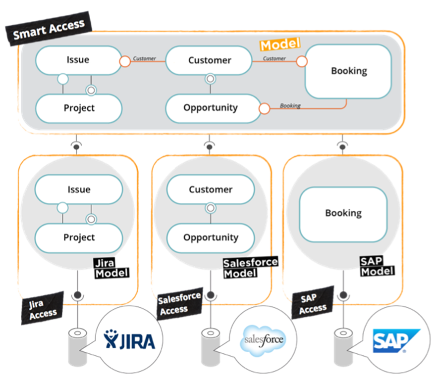 The smart access is a specific type of IncrementalAccess used as a delegating layer, controlling the logic of mapped data between its defined smart model and accesses from where the data required by smart model elements is stored. Once deployed, the integration is abstracted and allows data consumers to access the smart model as an API (either Java or REST), following tribefire's model-as-API paradigm.