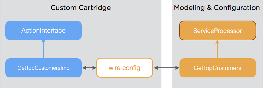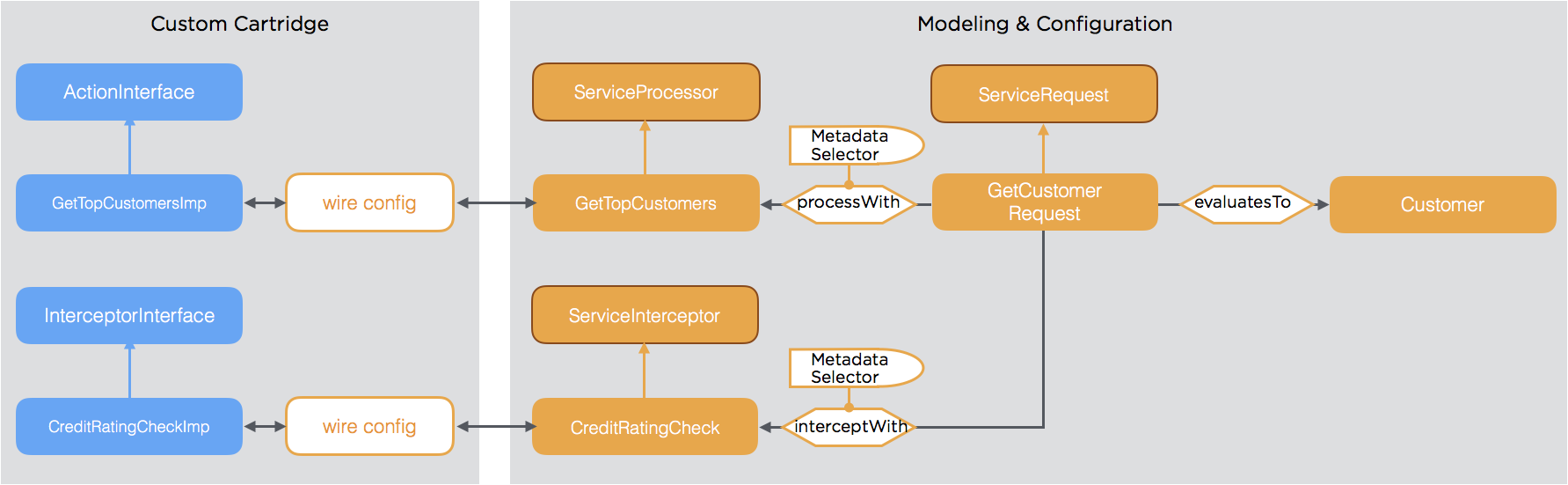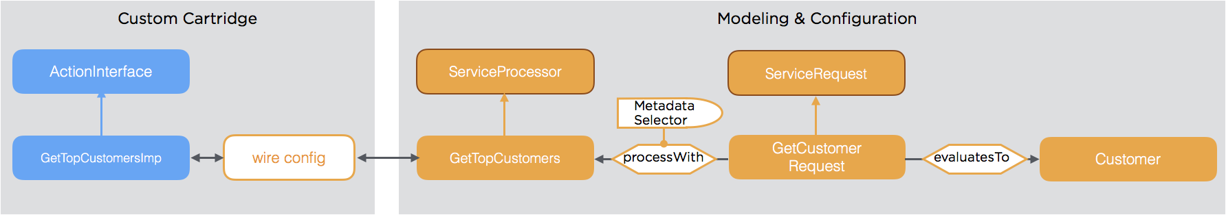 Service Requests are modeled entity types, too. The mapping to the actual service implementations is done using the following metadata: