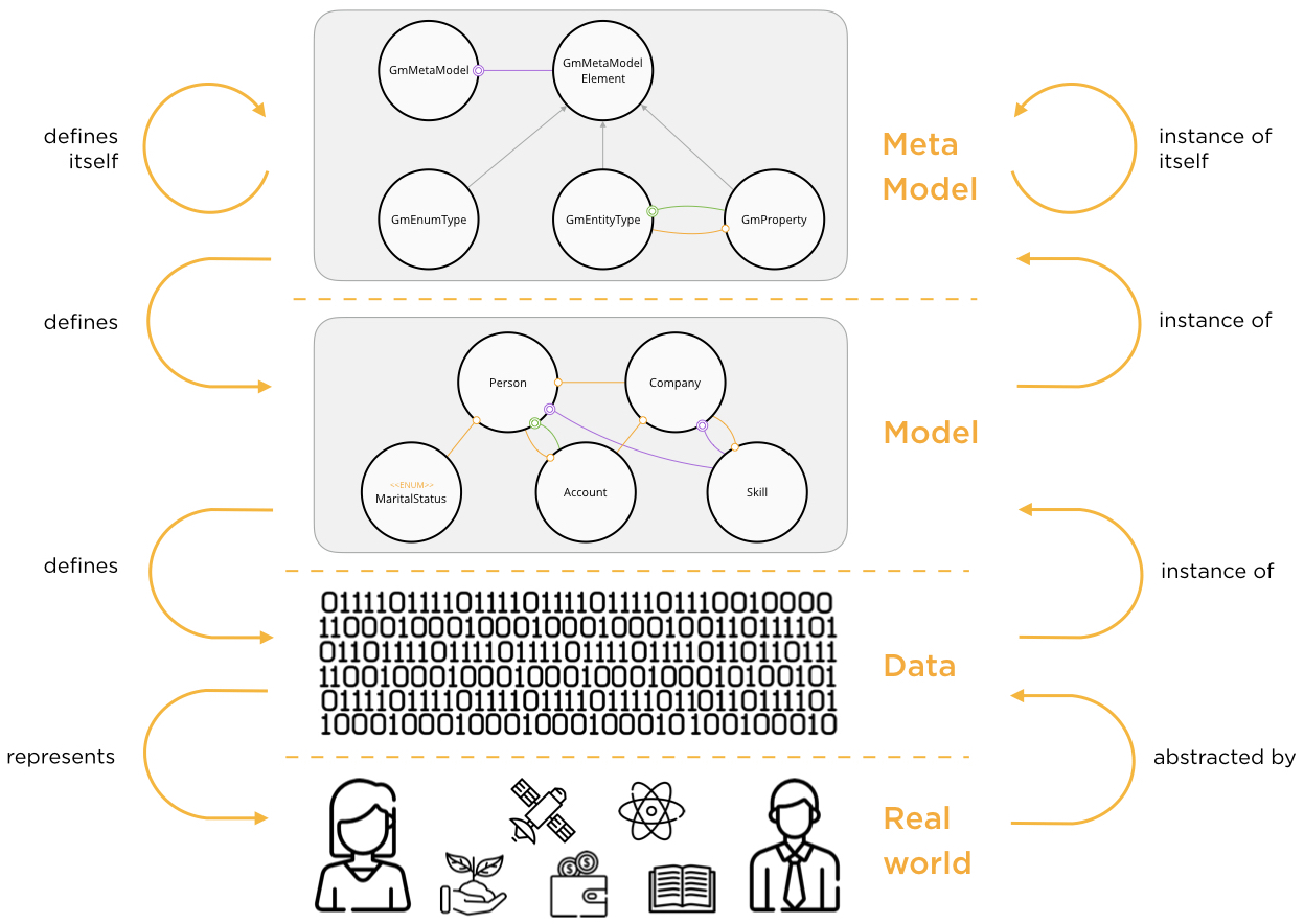 From a high-level perspective, a model is a representation of an excerpt of the real world. In tribefire, this is realized in several abstraction layers. The real world is abstracted by data representing it. This data is as diverse as the reality is, so it's hard to deal with it in a coherent way. To overcome this problem, homogeneous models are introduced that define the data in a normalized way. The data can then be considered as instances of the models and their elements.