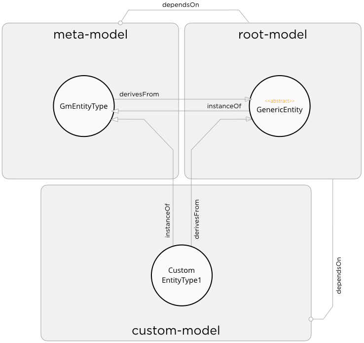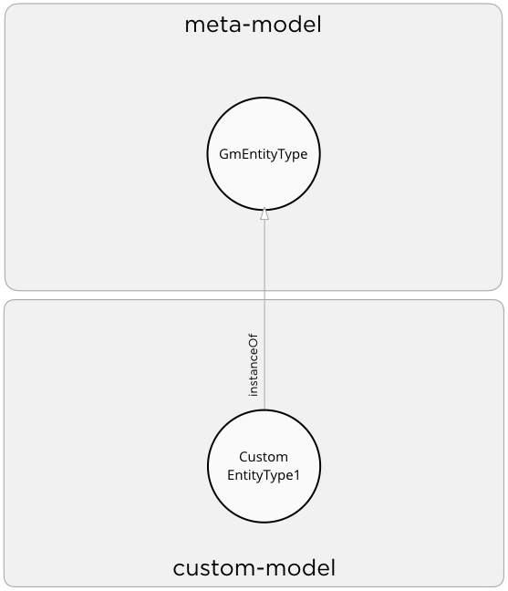 The illustration below shows this scenario in a simplified example, where a custom entity type in a custom model is created as an instance of GmEntityType from the meta-model.