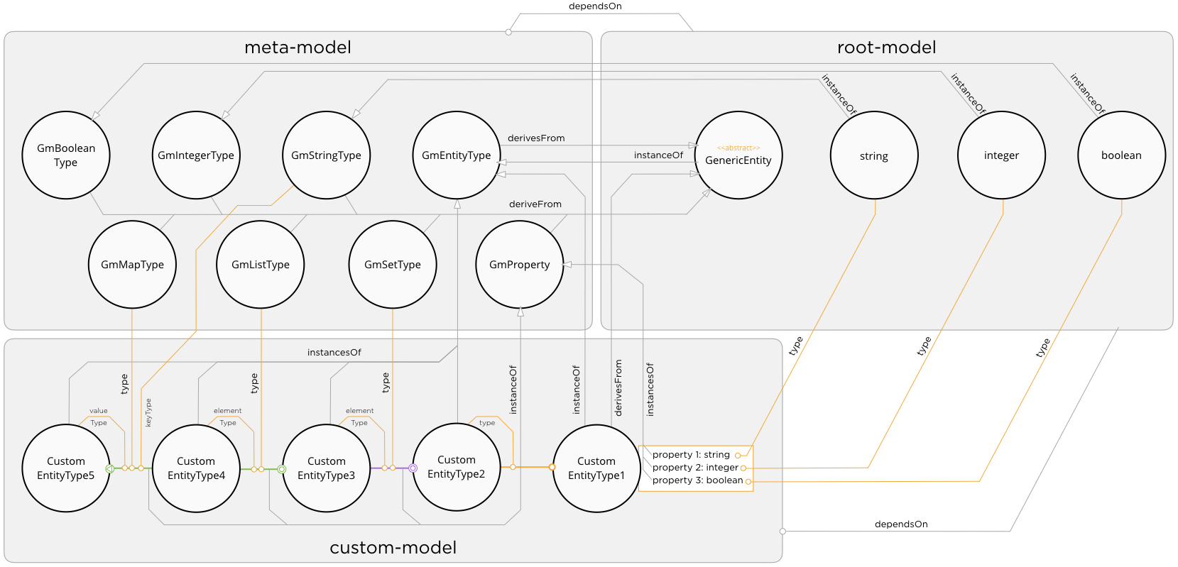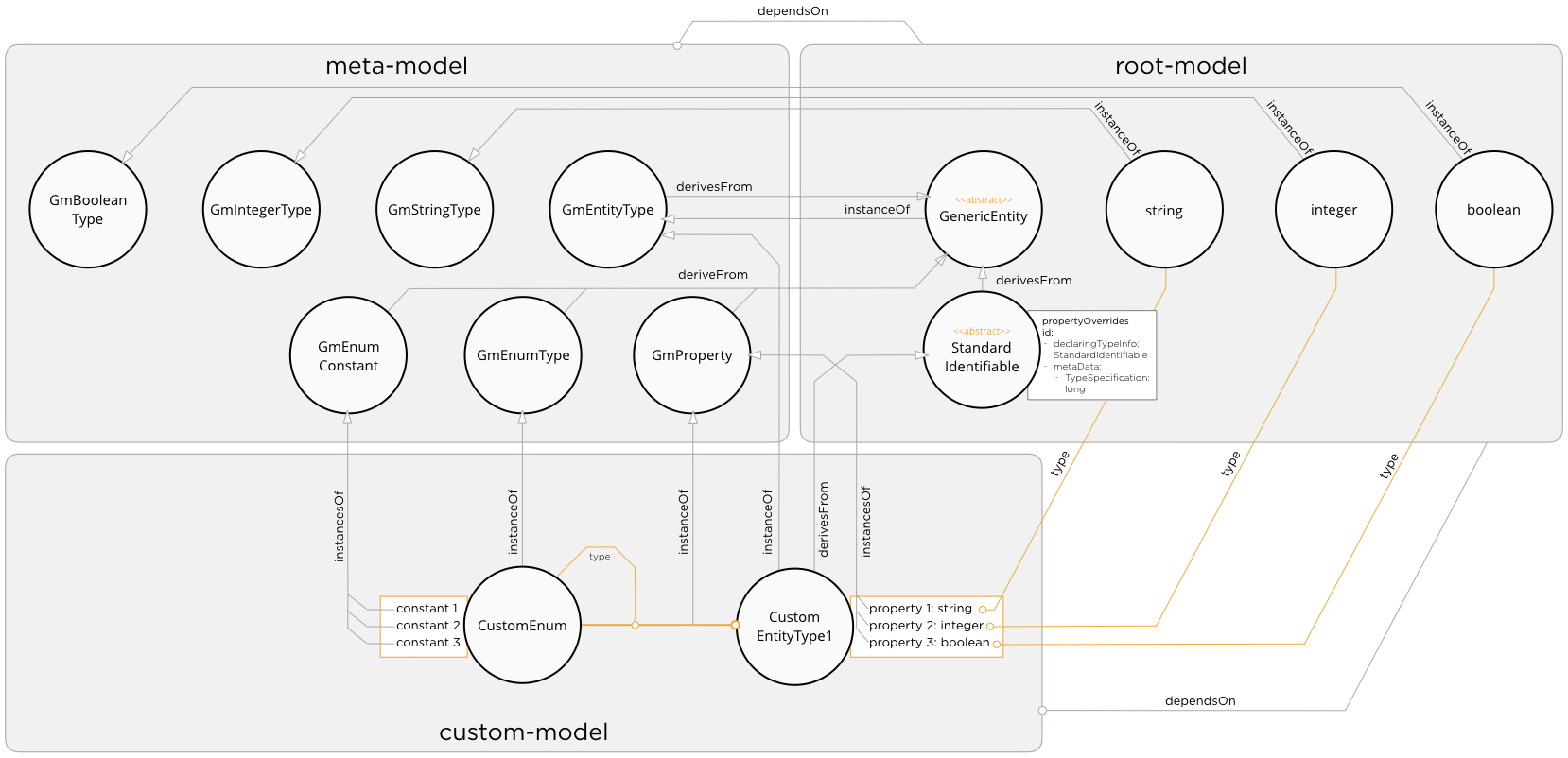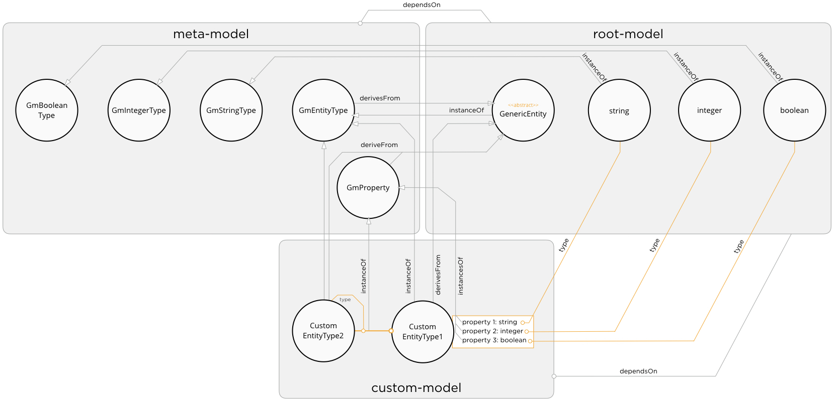 The complex property, depicting the single relation, references CustomEntityType1 as its type. To define the three simple properties the three types string, integer and boolean from the root-model are directly referenced. Those three types are instances of GmStringType, GmIntegerType and GmBooleanType from the meta-model, respectively.