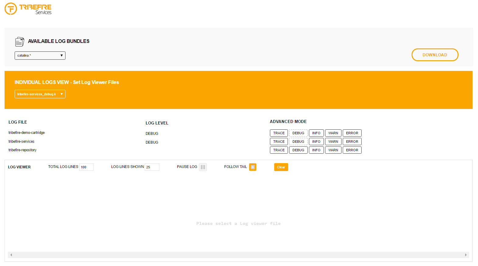 The tribefire Logs service provides a UI which displays and allows you to administer various log files.