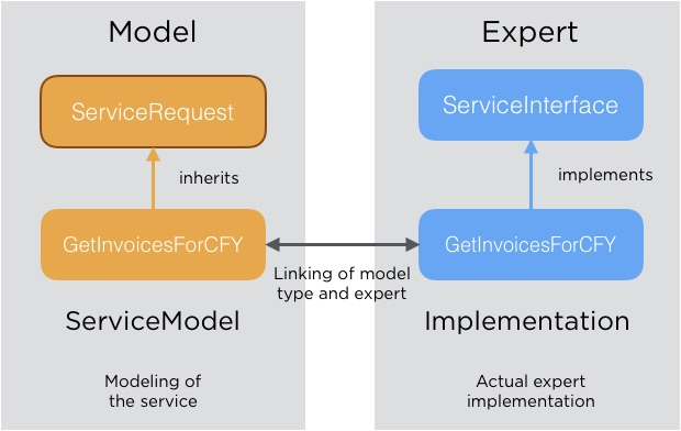 The entity types in the diagram above (and maybe more) are part of the service model. They are separated from the data model (e.g., Invoice) because they exclusively deal with the services. The data model itself is free of any service entity types. This allows for later reuse of the same model with different experts, i.e. services that deal with the actual business logic.