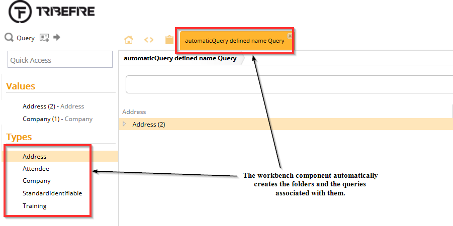 The Automatic Queries is a Workbench component. It is used to control how the Workbench component should function if it has not yet been configured. That is, if no workbench has been deployed, or a deployed Workbench has no folders defined. If this is the case, Tribefire automatically creates folders, which are then displayed in the left-hand panel, and their associated queries.