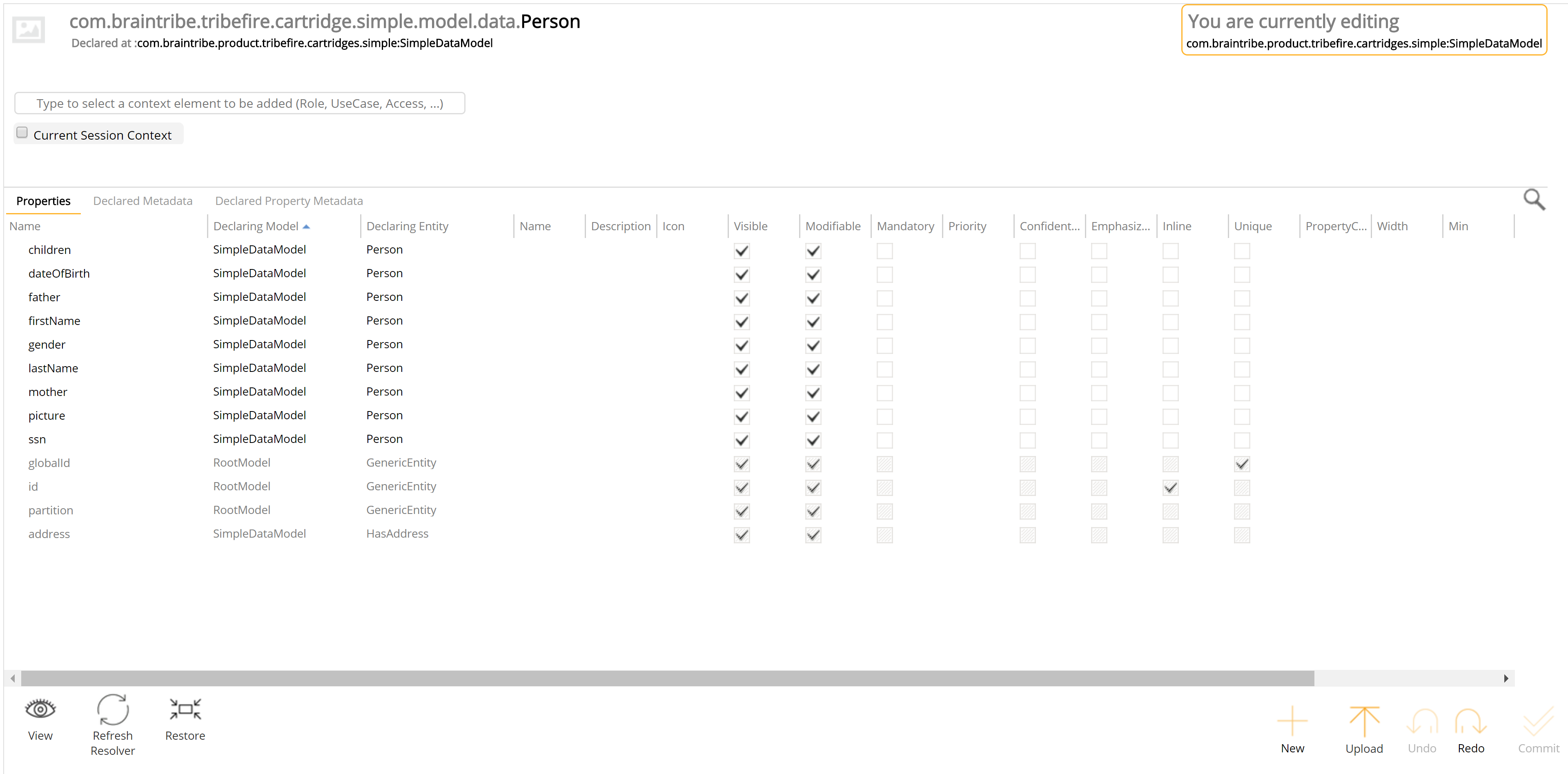 The metadata editor allows you to perform actions on metadata. You can open the editor by double-clicking an entity type.