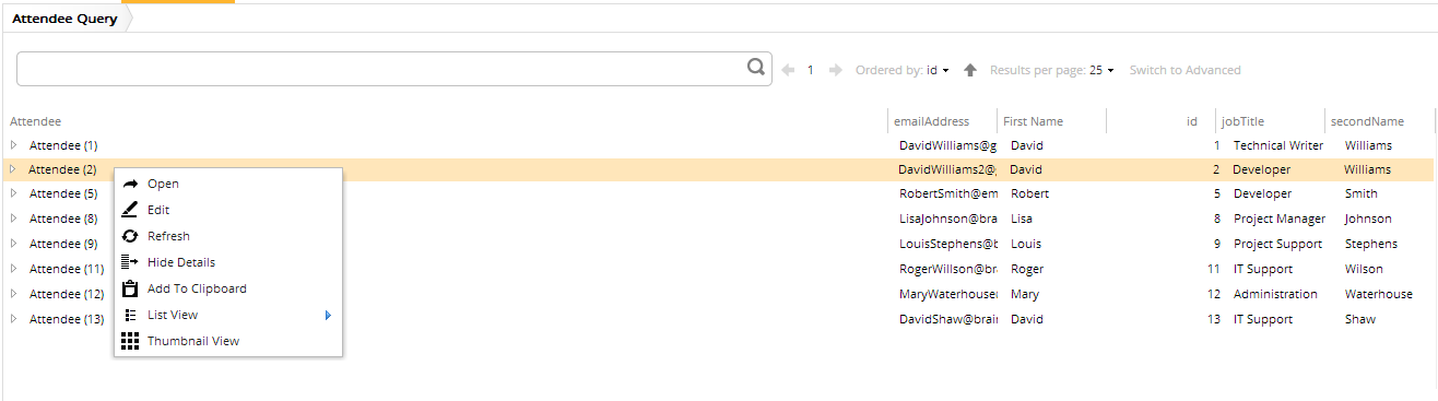 In this example the NonDeletable metadata is added to the Attendee entity with the id of 2. This results in not being able to delete that particular instance, which means, the Delete action is not visible when that instance is selected: