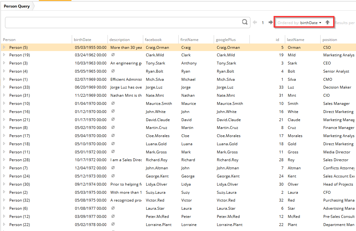 In the example below, the property being used is birthDate and the direction ascending (that is, from youngest to oldest). When displayed in Explorer, the Ordered by option is set to the default sort value, and that the results have been sorted from oldest date to newest.