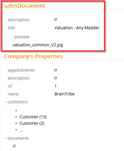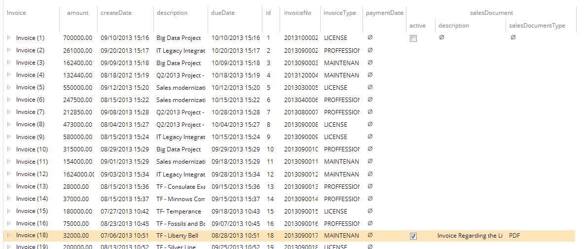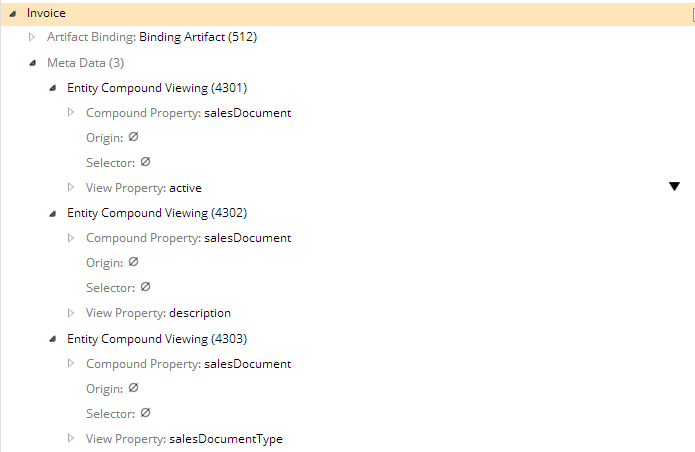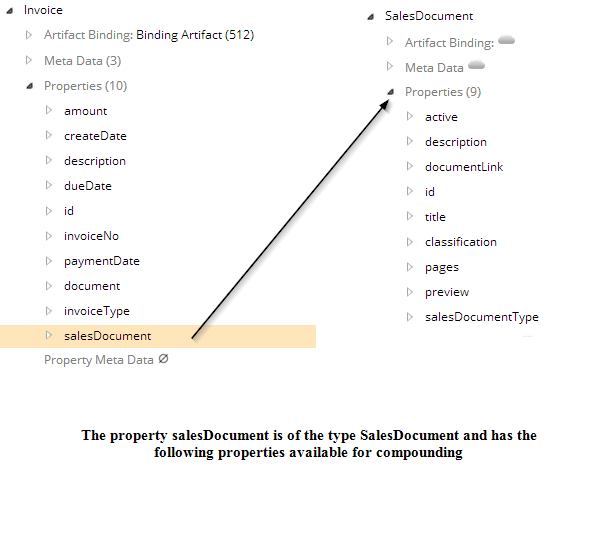 In the example below there is an entity called Invoice, which has a property belonging to it called salesDocument. This property is a complex type of the entity SalesDocument. The Compound Property, therefore, is defined as salesDocument, while the View Property is a property belonging to the entity SalesDocument.