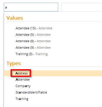If the Visible metadata is added, the element is visible in Explorer. In this example an entity type called Address has been configured with this metadata property. As shown in the screenshot below, Address is visible.