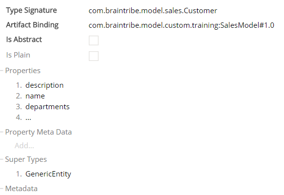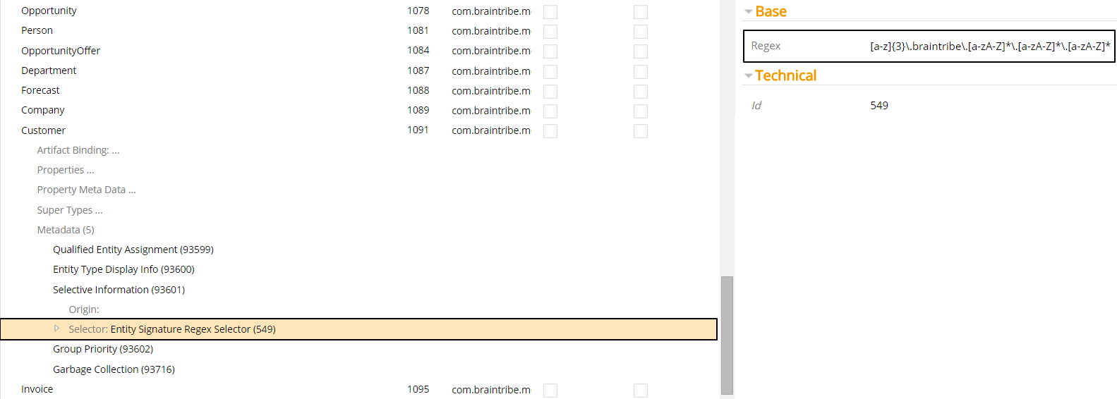 In this example, the metadata Selective Information was added to an entity called Customer, and the metadata was assigned a entity signature regex selector with the following regular expression: [a-z]{3}\.braintribe\.[a-zA-Z]*\.[a-zA-Z]*\.[a-zA-Z]*