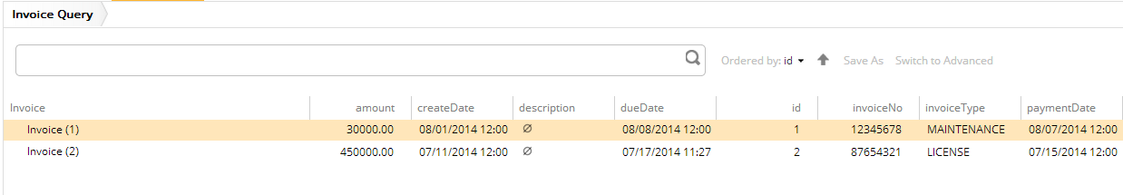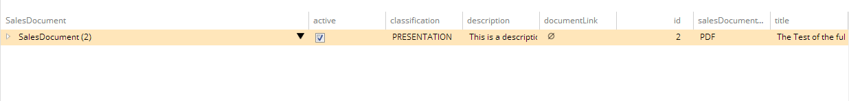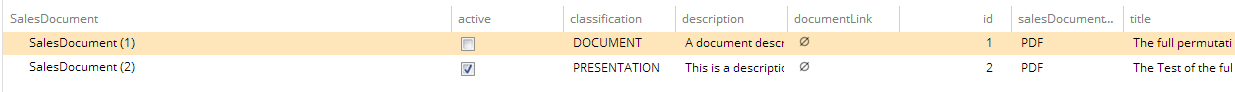 This example uses an entity called SalesDocument, which has a Boolean property called active. The metadata Visible was added to SalesDocument, meaning that no entities are shown without any additional Selector being defined.