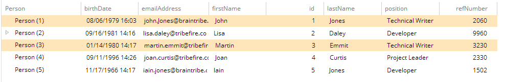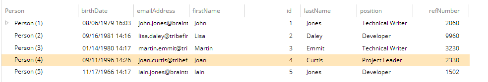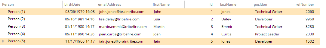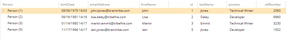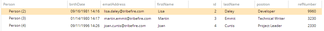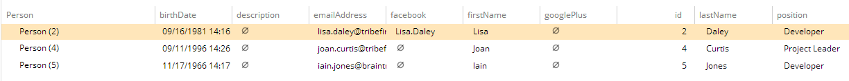 We add the Hidden metadata to the Person entity and define String Regex Property Discriminator as its selector. Then, we define its properties. We set discriminatorProperty to emailAddress and discriminatorRegex to [a-zA-Z]*.[a-zA-Z]*@braintribe.com.