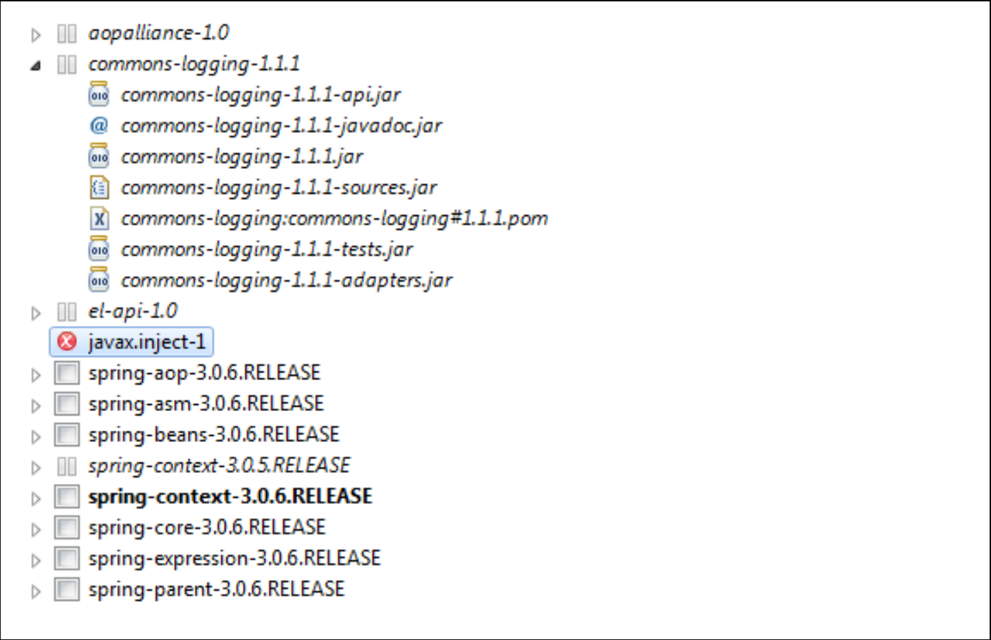 spring-context-3.0.5.RELEASE,aopalliance-1.0,el-api-1.0,commons-logging-1.1.1. -