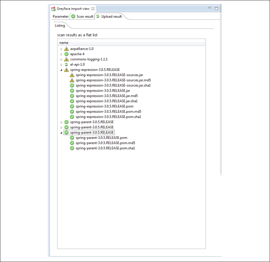 Parts Parts are only shown in the flat tab. If they are of a well-known type, i.e. POM, .jar, javadoc etc, they will have an associated icon attached. Again, if they exist in the target repository, the name is displayed with an italic font.