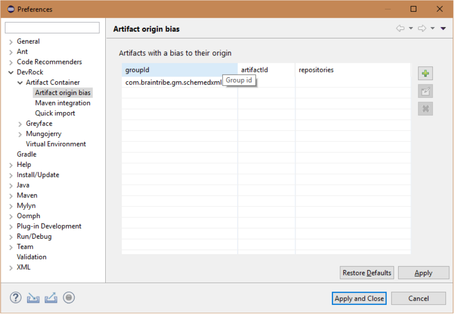 Artifact Container has a UI feature to access and edit the file. You can find the respective preferences page in your Eclipse under Window -> Preferences -> DevRock -> Artifact Container -> Artifact origin bias.