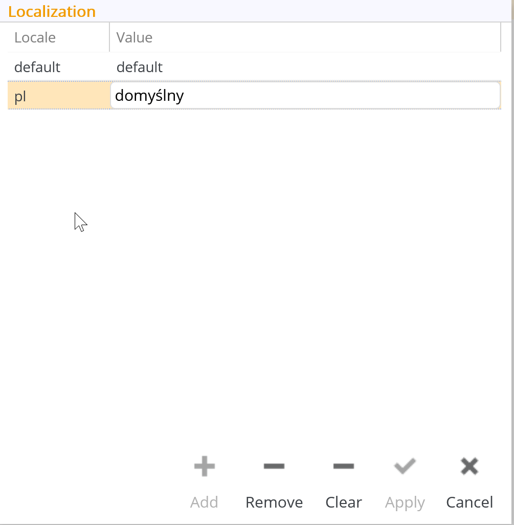 You can use the Add, Remove, and Clear buttons to manage the localization values in a list.